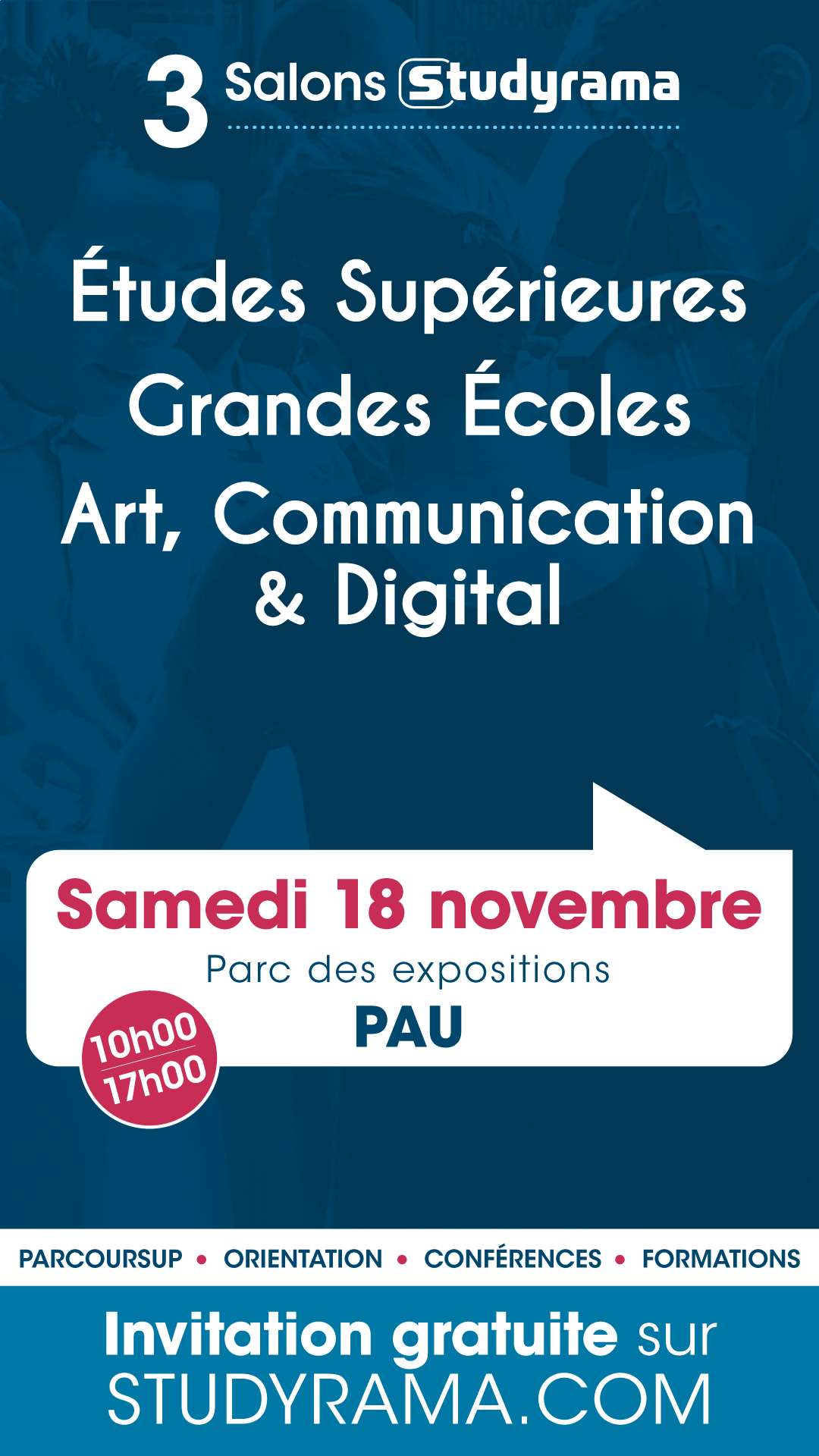 Studyrama organise sa 9e édition du Salon Grandes Ecoles, sa 19e édition du Salon des Études Supérieures, et sa toute 1e édition du Salon des Formations de l’Art, de la Communication et du Digital, le samedi 18 novembre 2023 à Pau. Lycéen, élève en classes préparatoires ou étudiant, ce salon vous permettra de rencontrer des écoles supérieures de la région Nouvelle-Aquitaine et de la France entière.